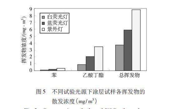 顯而易見,模擬自然通風和強制通風條件下,試樣中被測揮發物濃度明顯大幅降低。在設定的溫濕度和光照條件下,自然通風時試樣中苯系物( 苯、甲苯、二甲苯、乙苯) 濃度僅為密閉條件時的0.7,乙酸丁酯僅為密閉條件時的0.10。在強制通風時涂層試樣散發出的苯、甲苯、二甲苯、乙苯和乙酸丁酯的濃度微乎其微。與上述揮發物散發規律相似,總揮發物散發濃度在強制通風時最小,自然通風時次之,密閉時。