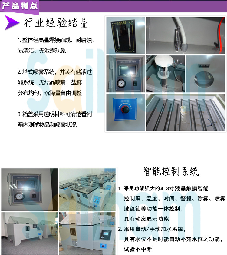 Product Categories大型鹽霧試驗室體制作材料:1. 鹽霧試驗箱整體為進口PVC增強硬質(zhì)塑料板,表面光潔平整,并耐老化、耐腐蝕;摒棄玻璃鋼材質(zhì)應 時間而產(chǎn) 生表面退色纖維化.全塑結(jié)構(gòu)鹽霧試驗箱更能滿足長期強酸、強鹽霧試驗爾不產(chǎn)生任何損傷。